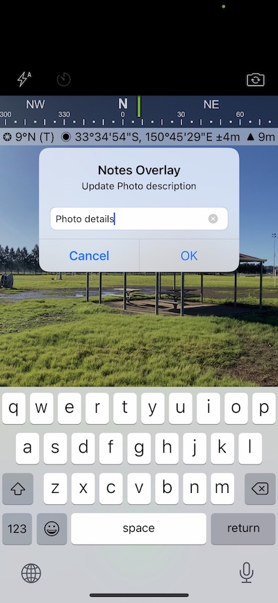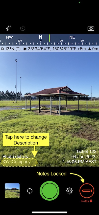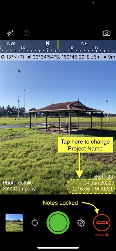 To add or edit the Project Name field, tap under the field approximately over the date and under the description field to do the same. Tapping onto the separate areas pops up the different text fields for typing notes, unlike the standard action of adding or editing notes after taking a photo with notes enabled (green pencil). Here is another way to add or edit text, straight after tapping the shutter button or click here to see how to add or change the text from photos in the Solocator app library.