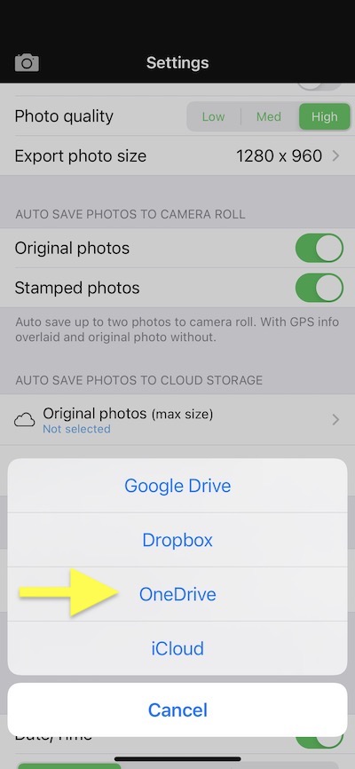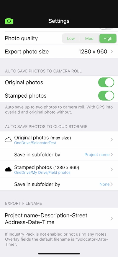 From v2.14, Solocator supports OneDrive for business, allowing organisations and their staff to log in via their business account and autosave photos to three destinations, as highlighted below.