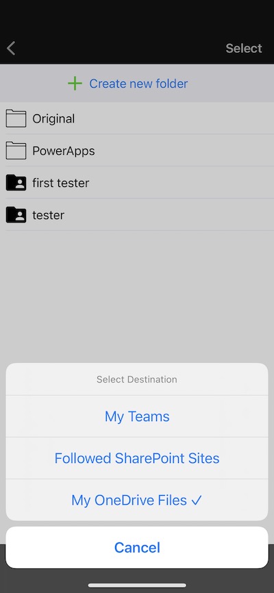 My OneDrive Files: After completing your login details, the default selected destination is your OneDrive files (see screenshot 8). This destination matches the “Files” location in the Microsoft OneDrive app or “My Files” in the Microsoft portal.