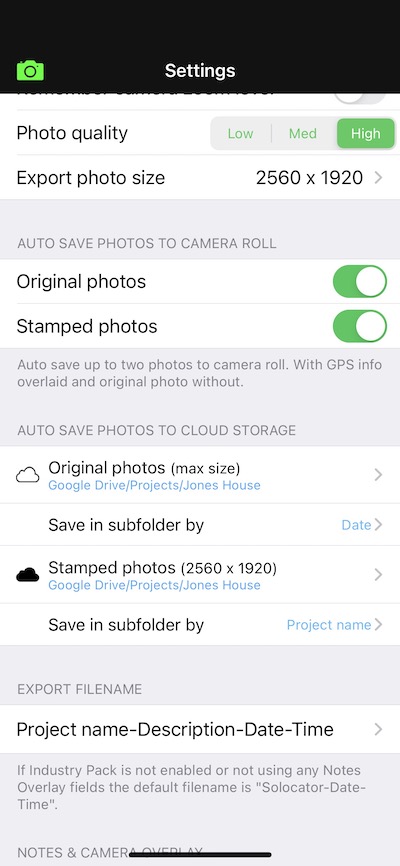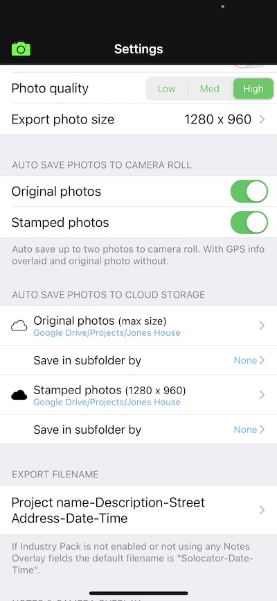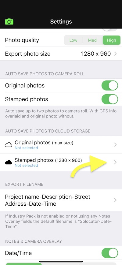 - Settings – Go to the Solocator settings screen and scroll down to the Autosave photos to cloud storage.