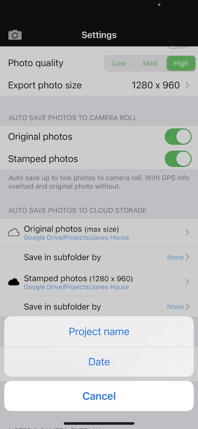 - Project Name & Date Subfolders – Under each type of photo file path destination, you can also select to save photos into subfolders that are auto-created by either the Project name used on the photos or the date the photos were taken. If autosaving both types of photos into one folder, a suffix is added to the filename of each photo; “Filename-original.jpg” and “Filename-stamped.jpg”.