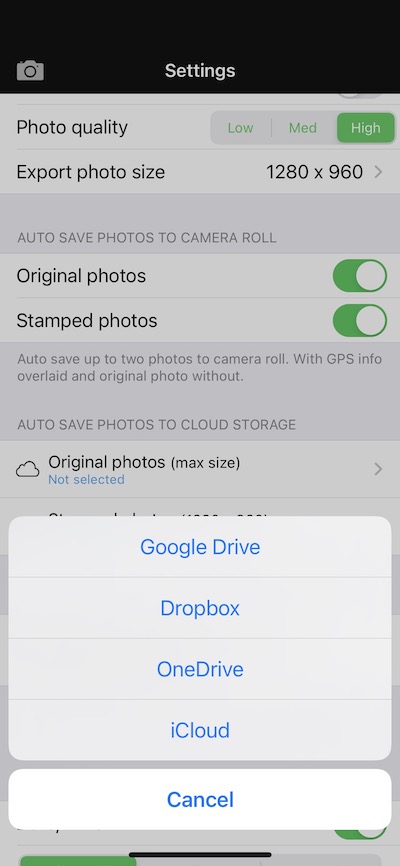 - Photo Type – You can autosave two photos; the Original photo (with no overlays) at the highest resolution and a Stamped photo with the selected overlays you see in the camera. Also highlighted is the current chosen export photo size, which can be changed.