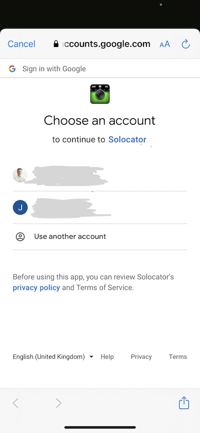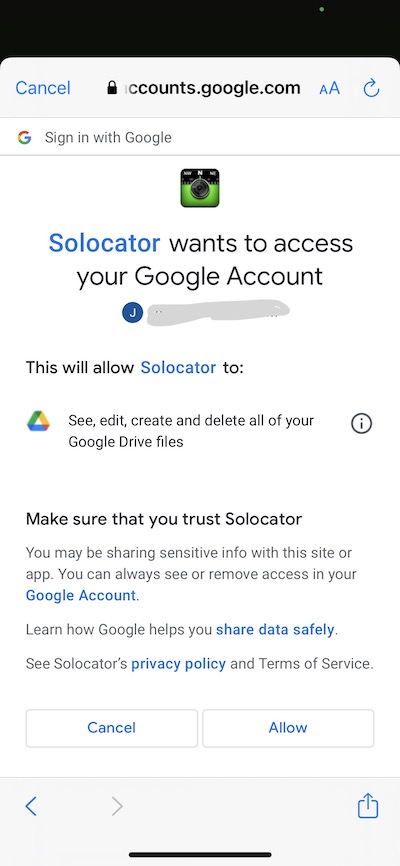 - Permission & Select Account – Next, you will be prompted to give permission for Solocator to save photos to your folder or create new folders in the select cloud storage service. If you have more than one user account for the cloud service or type of account (personal or business), please select and sign in with your user account.