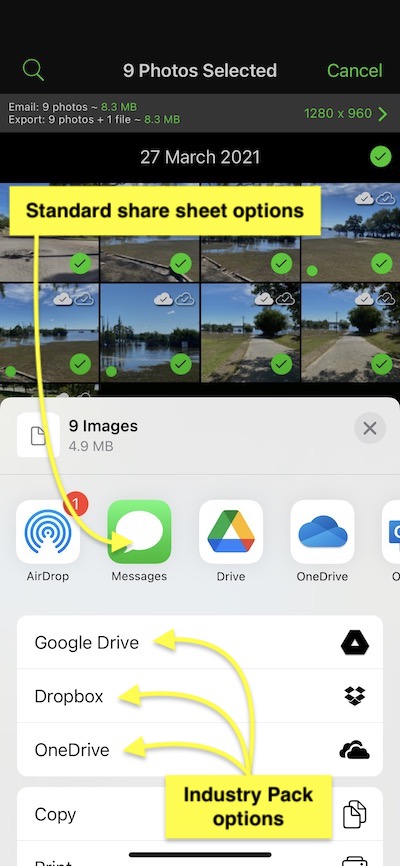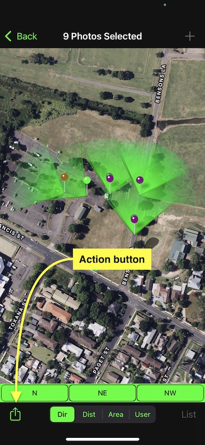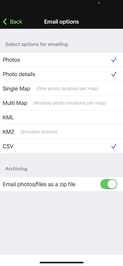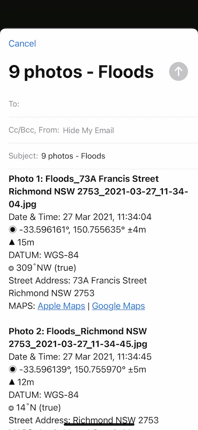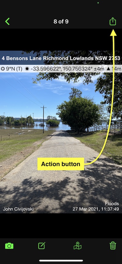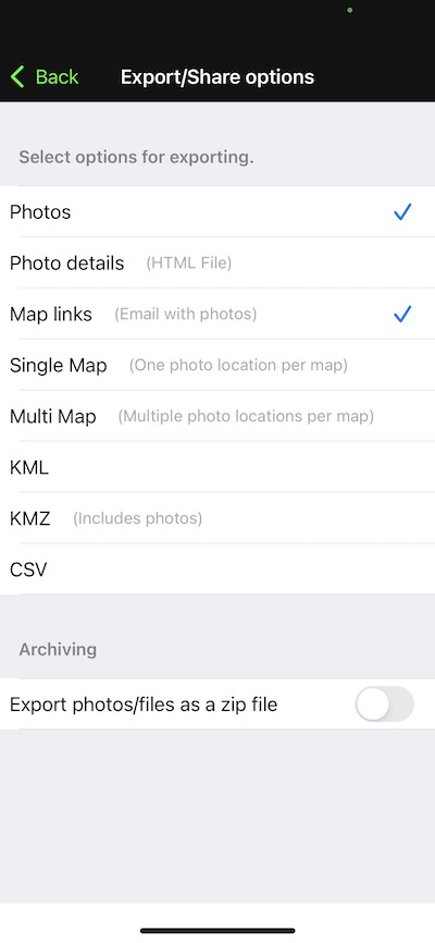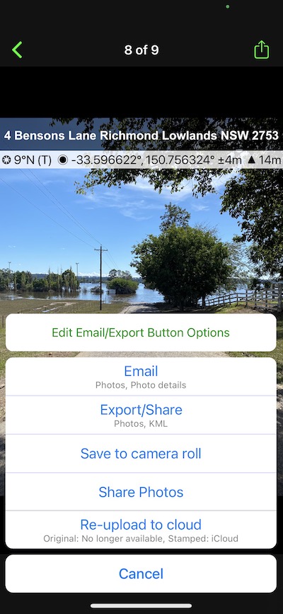 • Export/Share – This button can only be used with the “Industry Pack” you can customise the button to export/share several different options from a selection of Photos, Photo details (HTML file), Map links, Single map, Multi map, KML, KMZ or CSV. Some users will use this button to email via third-party email apps other than the default Apple mail app.