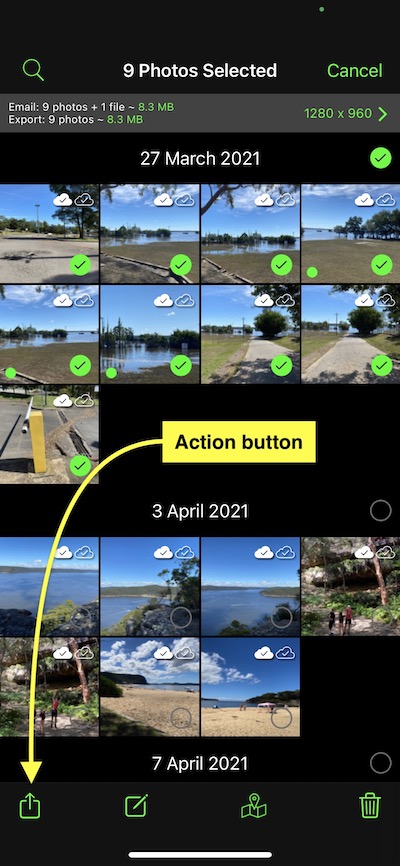 3. Tap the action button in the bottom left taskbar for multiple photos or the top right when exporting an individual photo. This opens the action sheet with four buttons to share photos as described below. Also, when sharing an individual photo, there is an additional button for re-uploading to the cloud after autosaving.