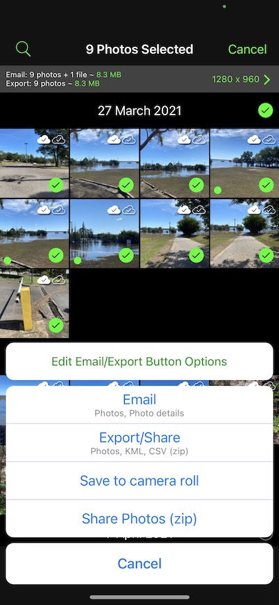 With Solocator, besides autosaving photos to the camera roll and selected cloud services, you manually export, share, and email selected photos from the Solocator photo library. There are two types of buttons to use via the action sheet: